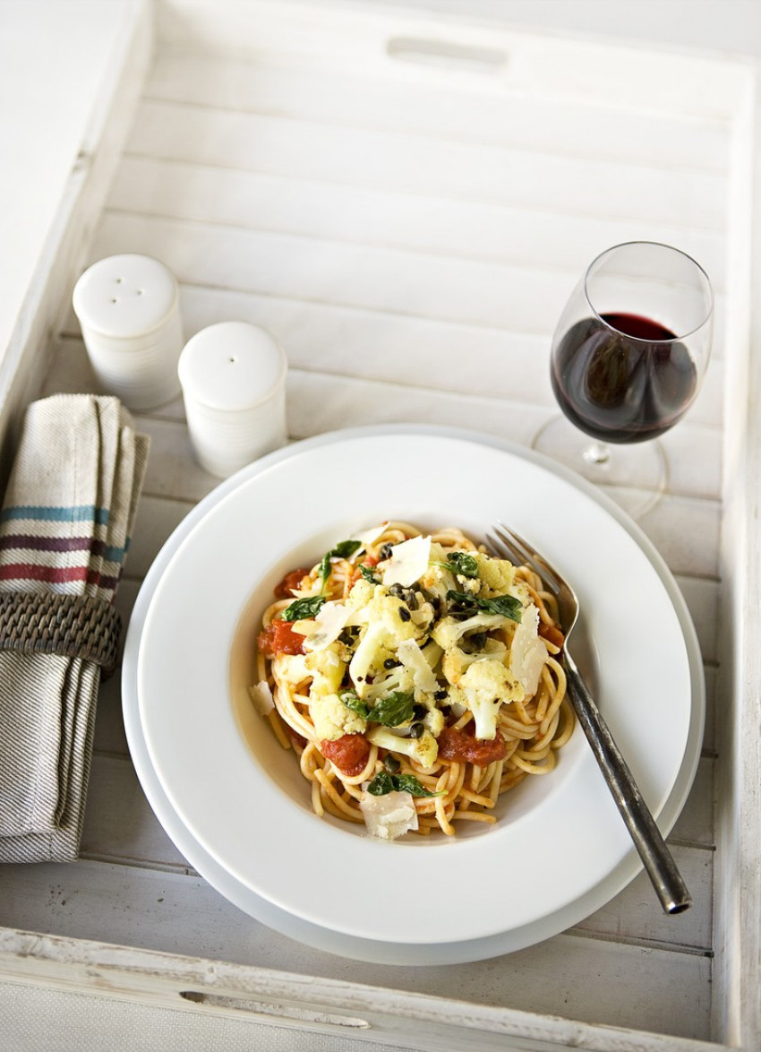To serve: Toss the cooked pasta with the tomato sauce and divide between serving bowls. Spoon over the cauliflower and top with shaved Parmesan.