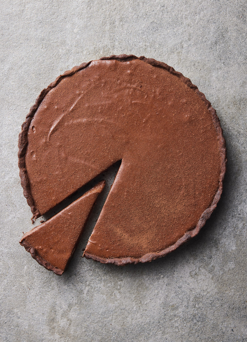 PASTRY: Whizz the flour, cocoa, sugar and butter in a food processor to form "breadcrumbs". Add the water and pulse just until clumps form. Tip onto the bench and squash together, then pat into a round. Chill for 15 minutes, then roll out between two sheets of baking paper into a circle slightly larger than your tin. Remove the top layer of baking paper and invert into the tin. Press in and trim the edges. Chill for 15 minutes.