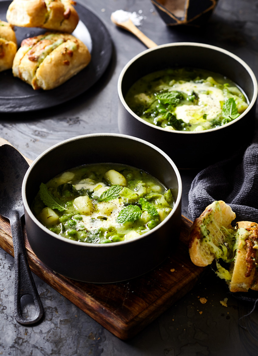 Blitzing the mint with half of the soup just before serving means it retains its gorgeous vivid green colour and bright fresh flavour.