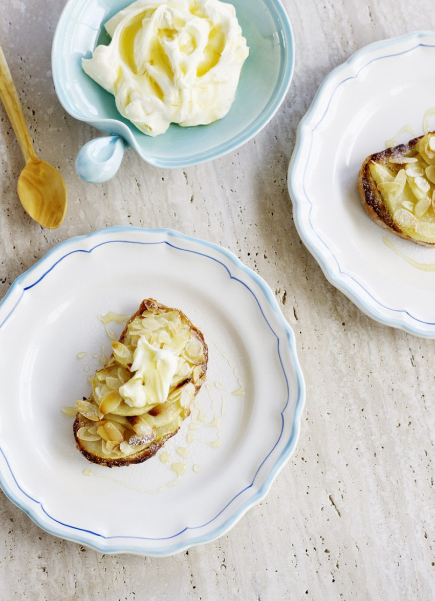 Pear and Almond Frangipane Bruschetta with Honeyed Creme Fraiche