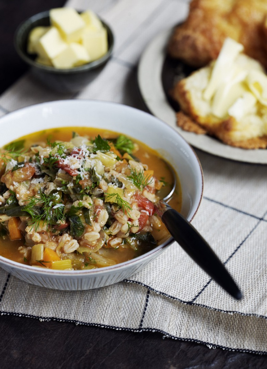 Heat the olive oil in a large saucepan. Cook the onion, leek, carrot, garlic, rosemary and cumin with a good pinch of salt over a medium heat for 15 minutes. Add the tomatoes, stock and pearl barley and bring to the boil. Simmer for 20 minutes or until the barley is tender. It will still have a chewy texture when cooked.