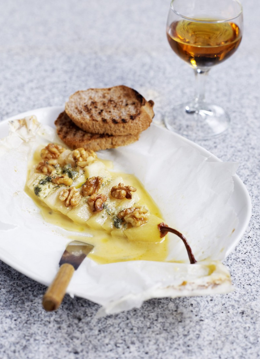 Crumble over the cheese then the walnuts and drizzle with honey and cream. Bring the edges together and seal by folding the sides over and securing with staples or paper clips. Transfer to a baking tray and roast for 10-15 minutes until the pears are tender and the cream is bubbling.