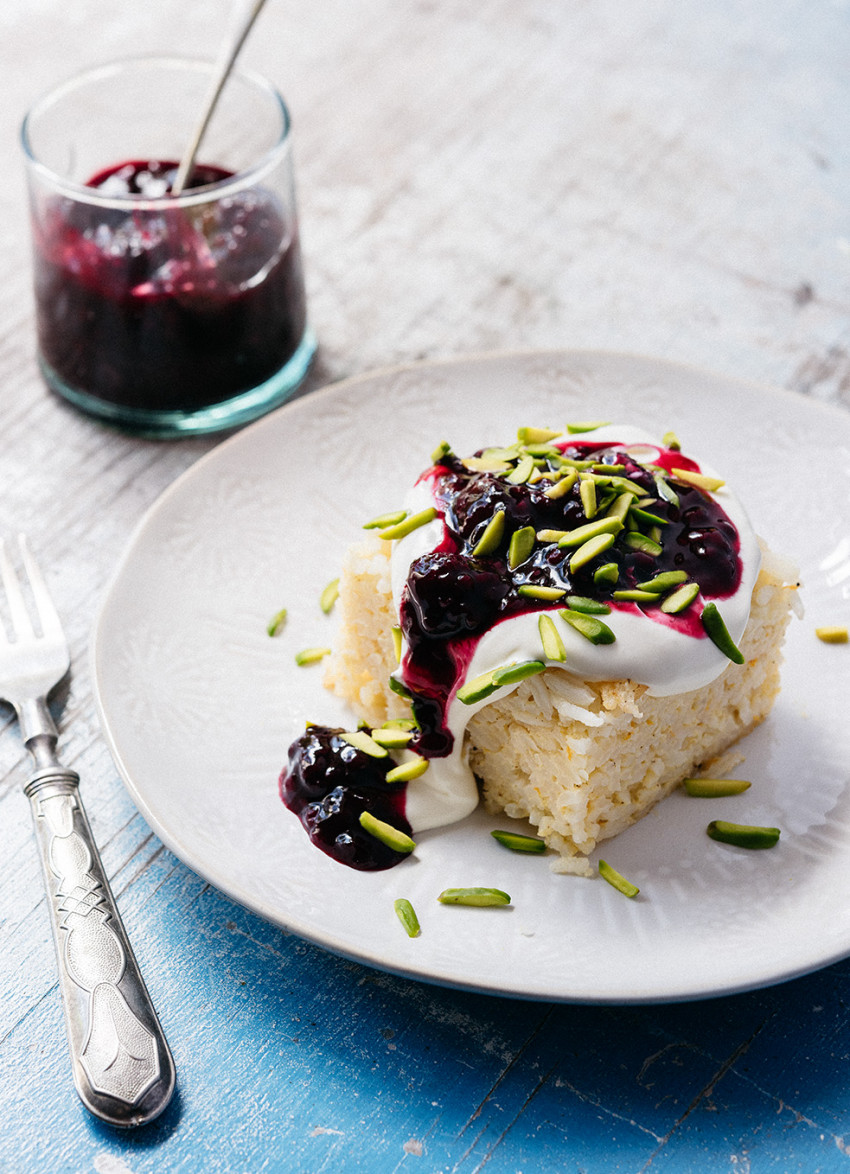 A cross between a rice pudding and a cake, this fragrant dessert is perfect served warm topped with the berry sauce and cream of choice.