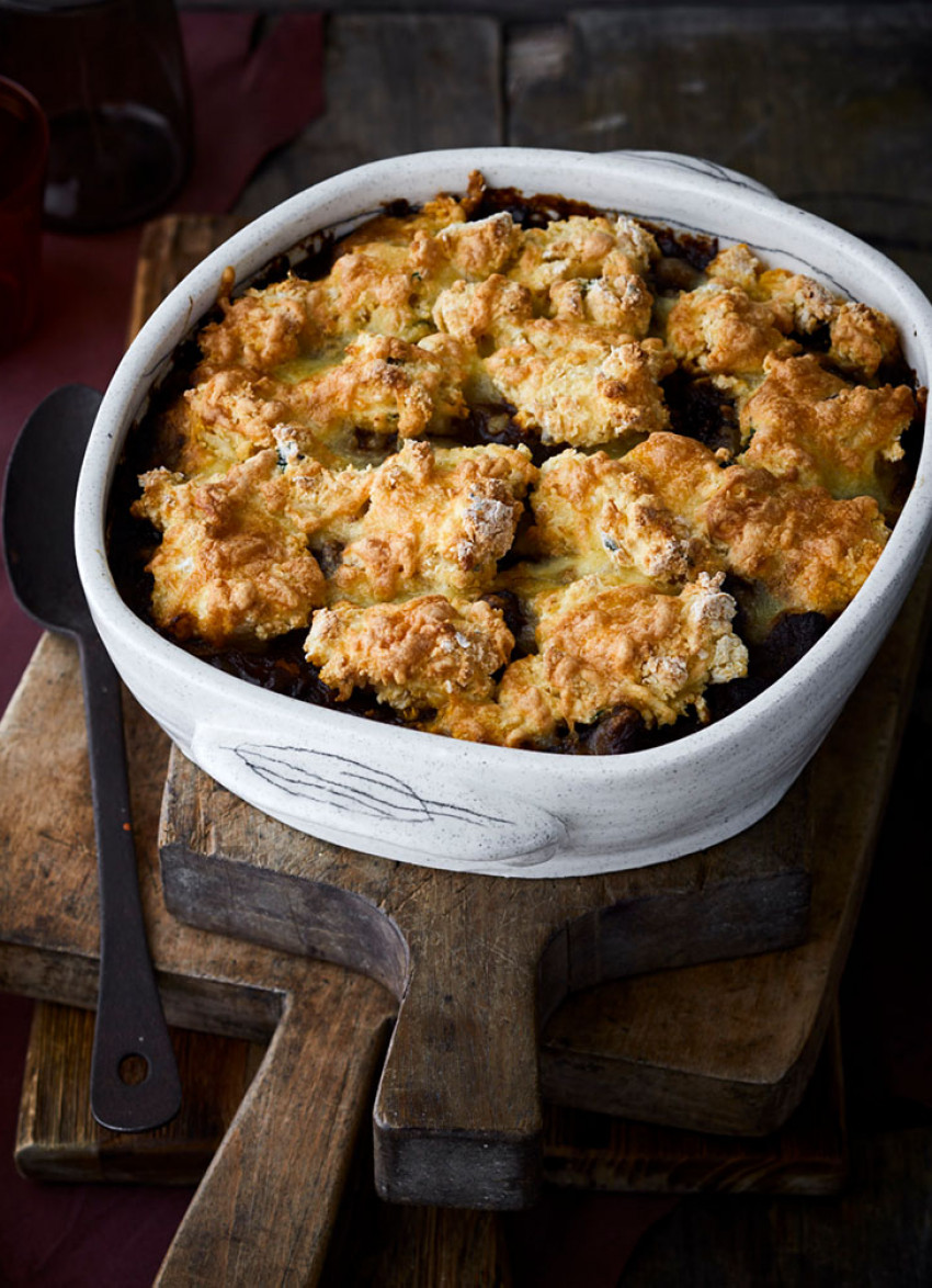 Polenta and Cheese Dumplings: Increase the oven temperature to 180°C fan bake. Combine the flour, baking powder, polenta, cheese and salt in a large bowl. Mix the milk and egg together and stir in until just combined. Add a little more milk if the mixture is too dry. Pull off small clumps of the dough and place on top of the meat. Grate over extra cheese and cook for 20 minutes until puffed and golden.