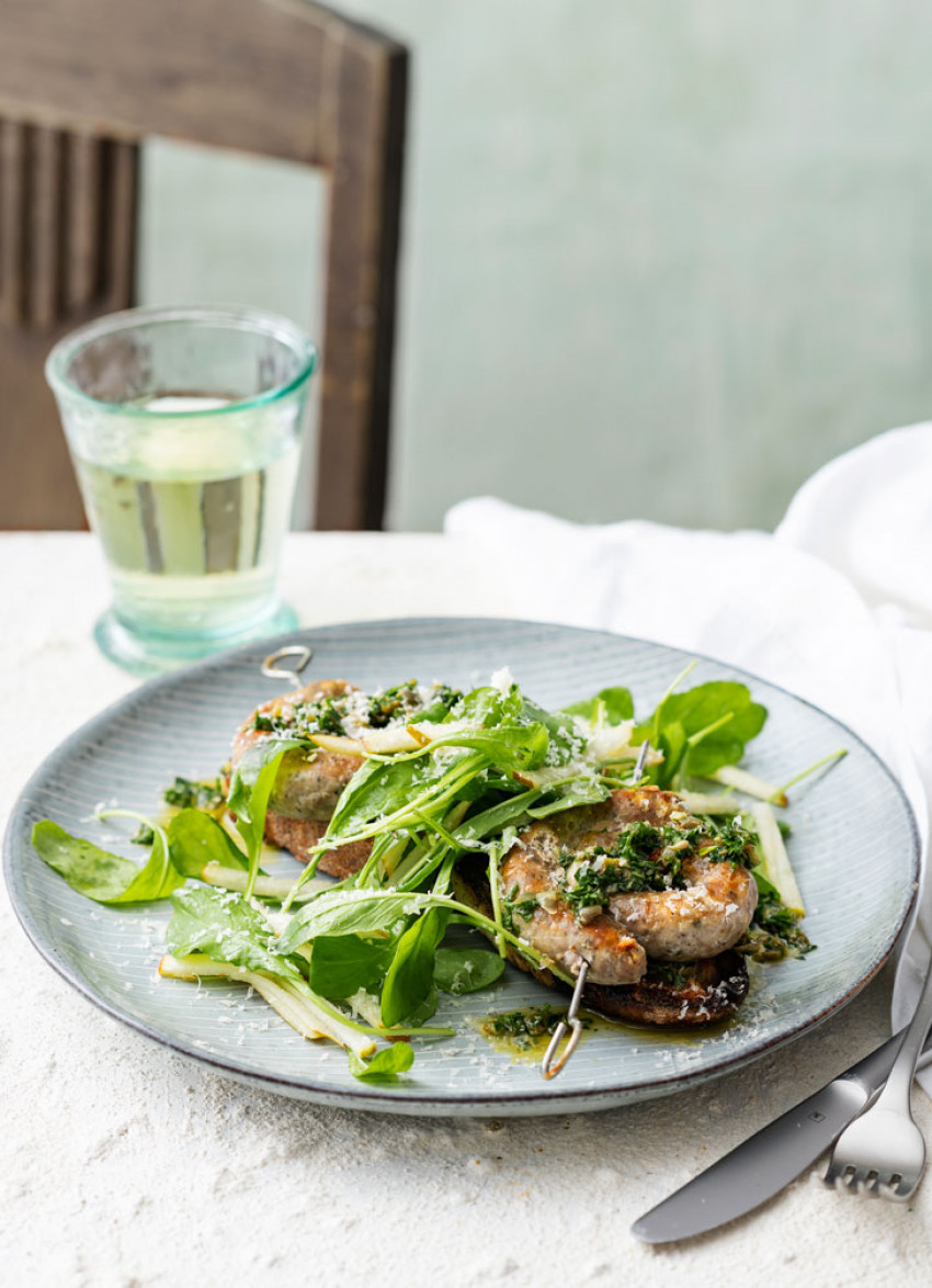 To serve: Place 1-2 sausage coils on top of the bread and spoon over the salsa verde. Top with salad then a generous grating of parmesan.