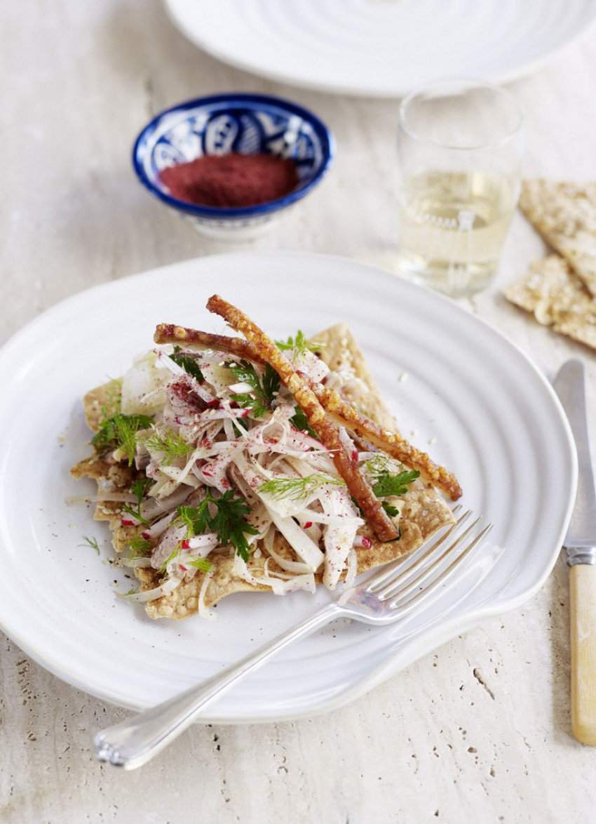 To serve: Remove the crackling from the pork and cut into long pieces through the score lines. Slice the excess fat from the top of the pork and discard. Slice the meat thinly and add to the fennel salad. Break each piece of mountain bread in half and place one piece in the middle of each plate. Top with the salad and a couple of pieces of crackling. Serve the remaining mountain bread separately.