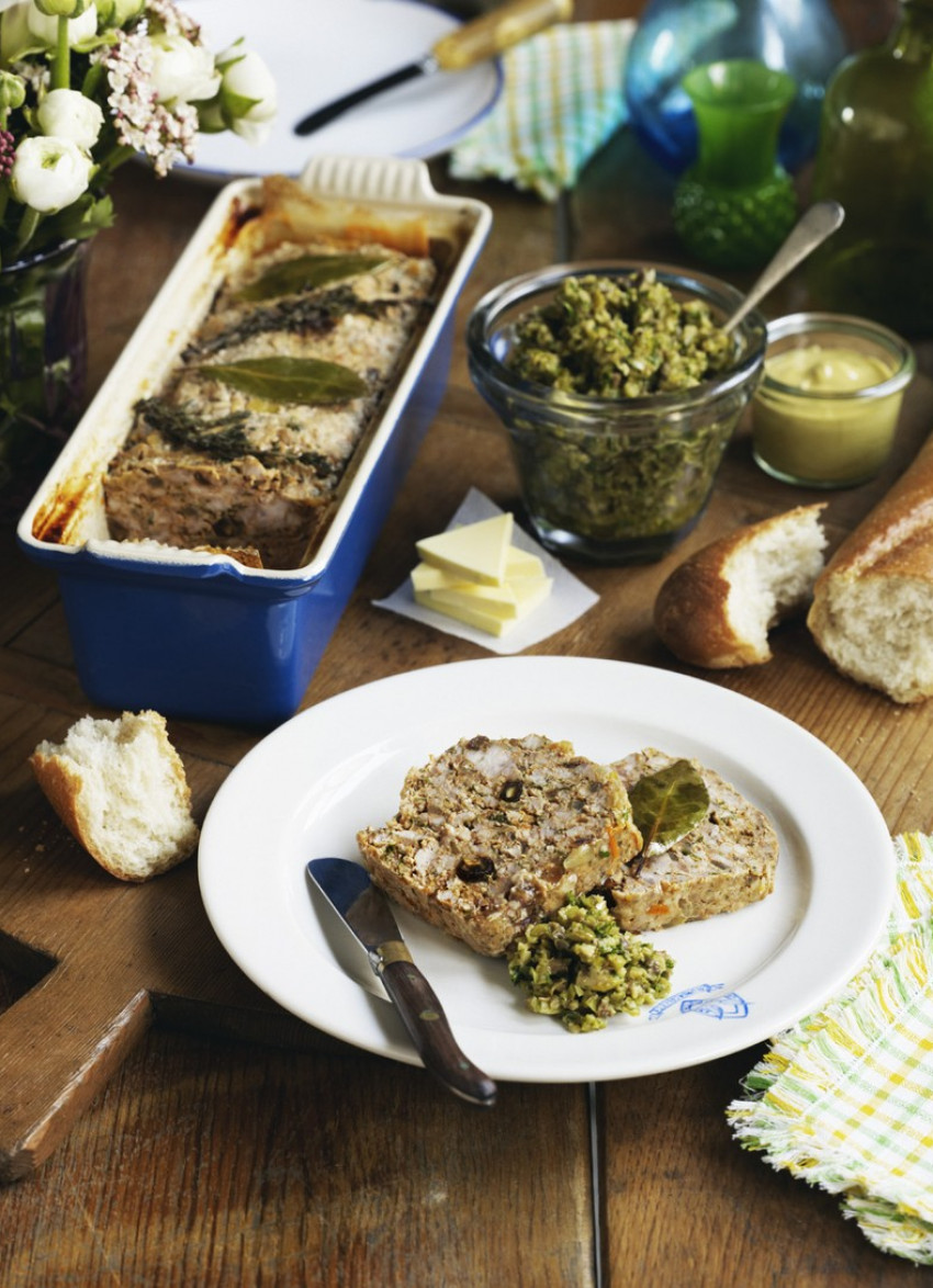 To serve: Remove the terrine from the dish and scrape off the excess jelly. Cut into slices and serve with the caper and olive salsa, crusty bread and butter. Serves 8