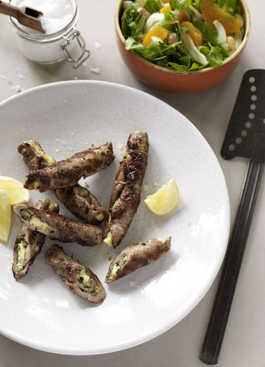 To assemble: Lay the pork slices on the bench and spread with Dijon mustard. Divide the breadcrumb stuffing between them, pressing it on lightly. Cut the feta into long slices and lay one on each piece of pork. Roll up from the long side and secure with kitchen string. Refrigerate if not using immediately.