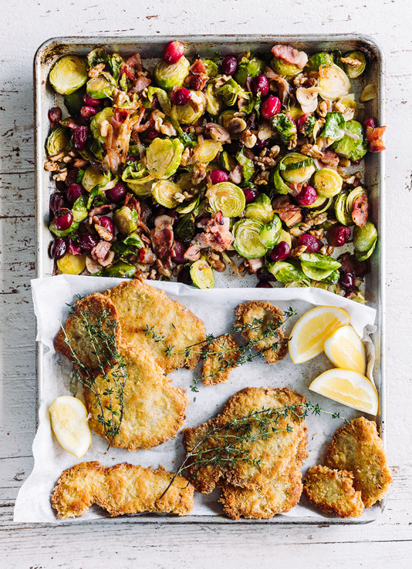 Heat a little oil and butter in a large sauté pan and cook the pork until golden on both sides and cooked through. Serve with the Brussels Sprouts with Bacon, Grapes, Walnuts and Thyme. Serves 4.