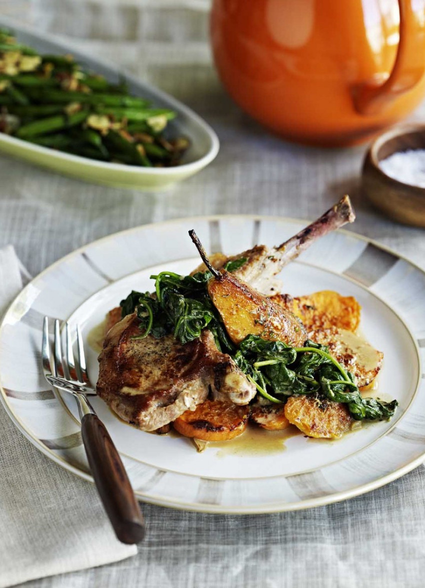 To serve: Place 1 pork chop and two pear quarters on each plate and spoon over the sauce. Serve with a wedge of Kumara and Parmesan Gratin and Green Beans with Almonds, Parsley and Lemon on the side.