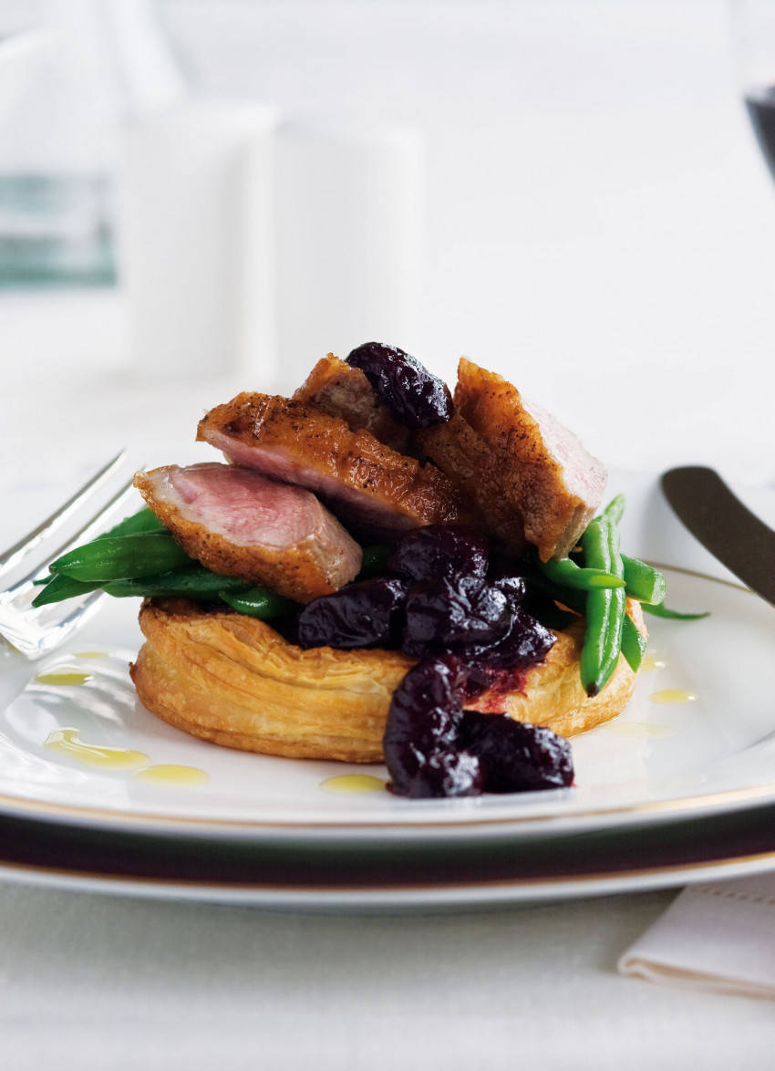 Place a mushroom tart on each serving plate. Top with hot, cooked beans. Slice the duck thinly across the grain and lay on top of the tart. Spoon over some of the cherry relish and drizzle with a little porcini or truffle oil if using. Garnish with a sprig of thyme.