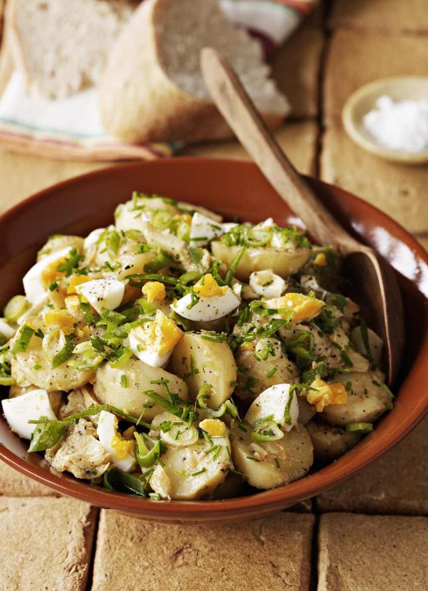 Whisk the mustard, garlic, vinegar, olive oil and the chives together. Season and pour over the warm potatoes. Toss gently to combine. Add the chopped eggs and spring onions and fold through.