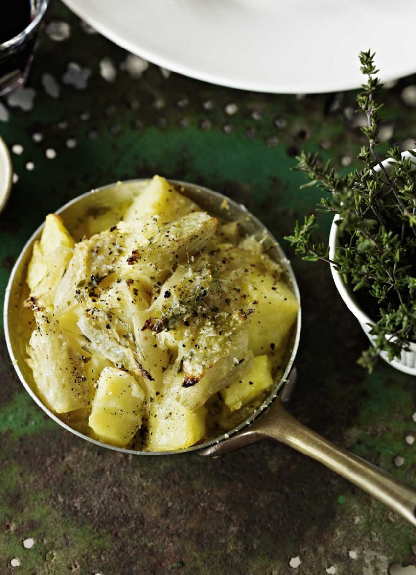 Gratin: Cut the potatoes into 3 cm chunks. Cook in boiling, well salted water until just tender. Drain well. Heat the oil and butter in a sauté pan and cook the onion, fennel, garlic and thyme for 10 minutes. Add the cream and chicken stock and bring to the boil. Season and simmer for 5 minutes. Put the potatoes in a greased, 6 cup capacity gratin dish and pour over the fennel and stock mixture. Sprinkle with Parmesan and bake for 35-40 minutes until golden and bubbling.