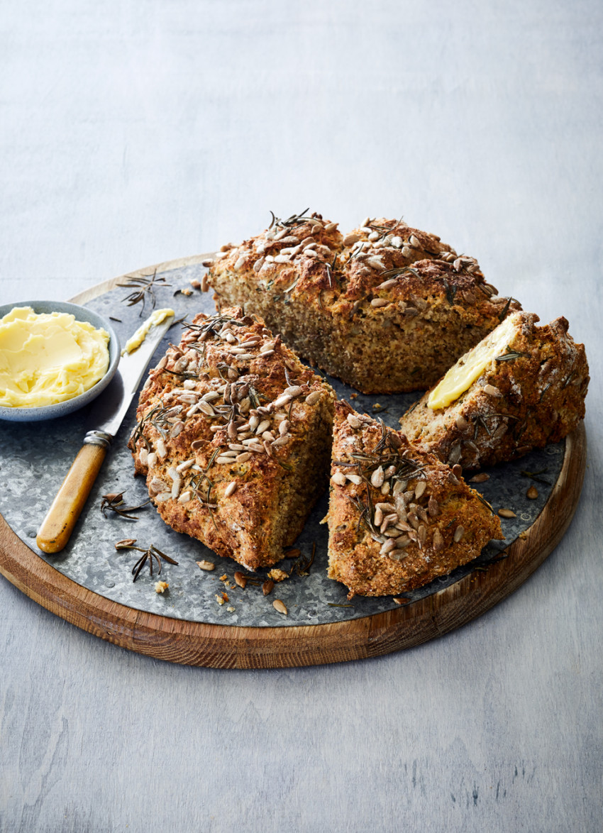 Slide a flat baking tray under the baking paper and score the top of the loaf with a sharp knife, making 3cm deep cuts. Scatter over the extra sunflower seeds and rosemary sprigs then dust with a light sprinkling of flour.