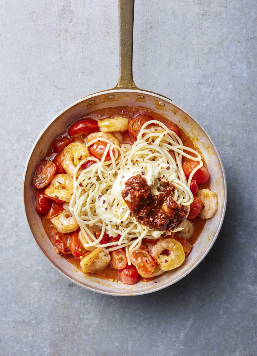 Heat the oil in a large frying pan over a high heat. Add the tomatoes, garlic and fennel seeds and season with salt. Cook until some of the tomatoes are starting to collapse and release their juices. Add the harissa and prawns and cook for 2-3 minutes. Add a couple of tablespoons of the reserved pasta water if the sauce is too thick. Season with salt and pepper. Add the pasta and gently toss together. Serve with the stracciatella over the top and extra harissa if desired, plus a sprinkle of chilli flakes.