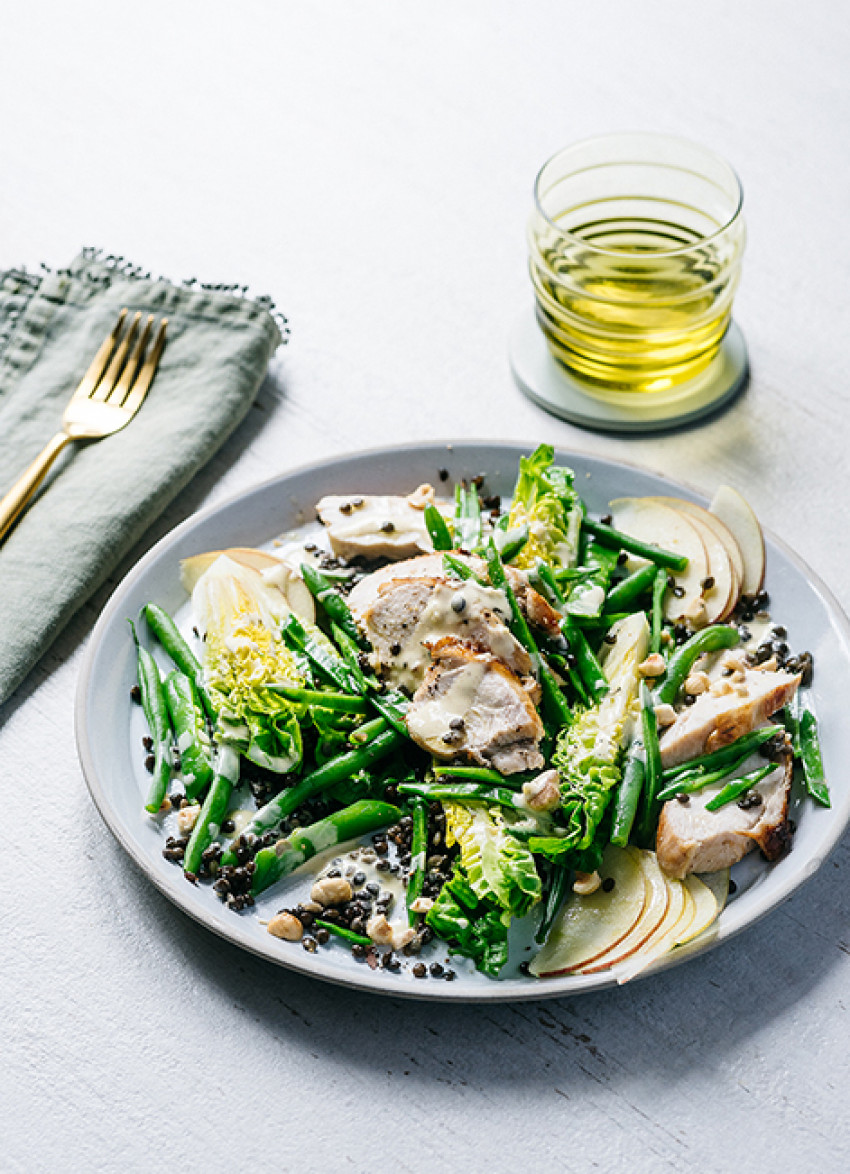 Puy lentils are my go-to base for a range of salads. This one’s topped with tender chicken, juicy slices of apple and crunchy hazelnuts with a tangy mustard dressing.