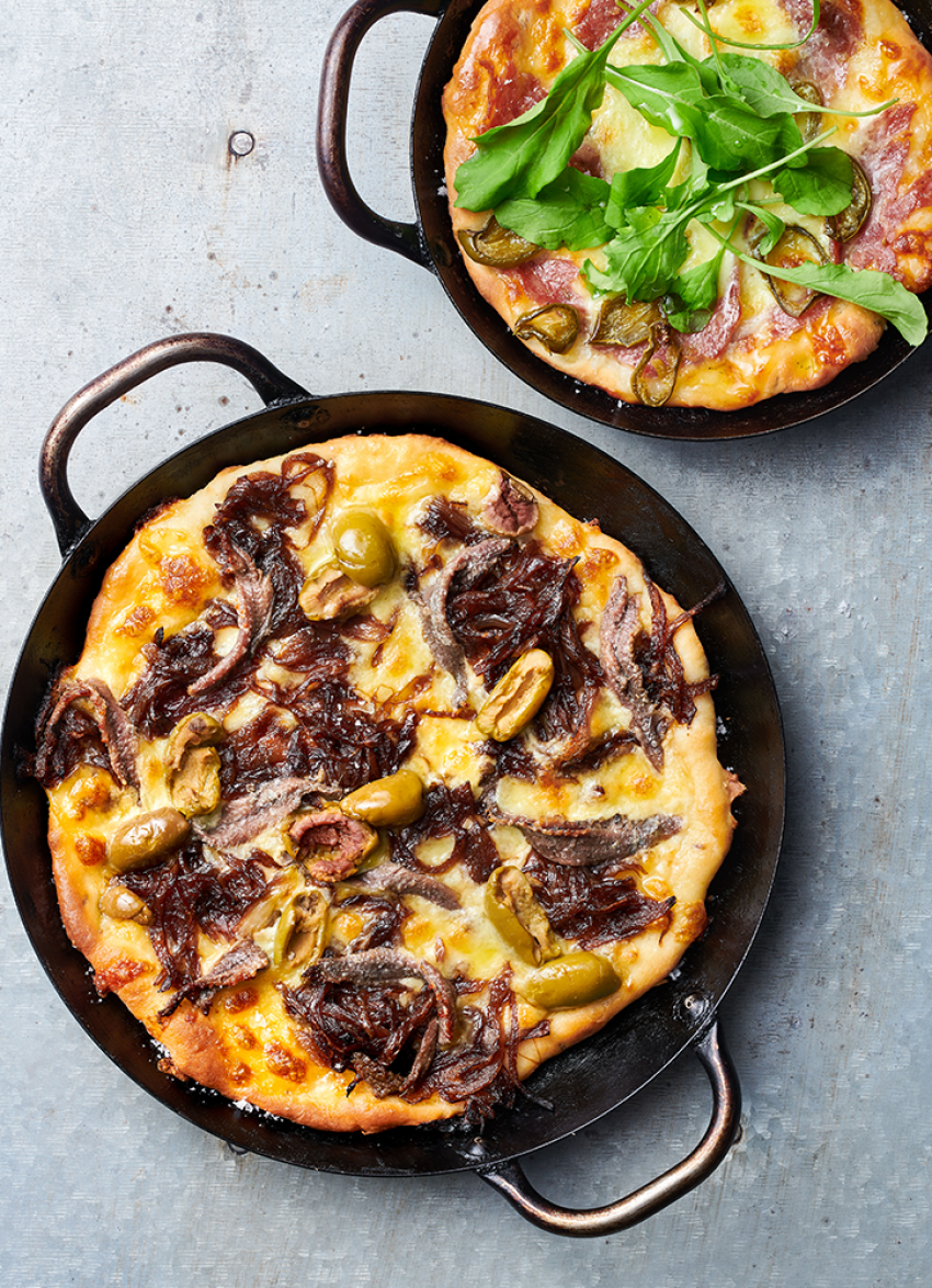 To cook: Roll or press out the dough and place in the prepared pan/s, bringing it halfway up the side. Top one with caramelised onions, a few anchovies and green olives. Top the second dough with salami, jalapeños and mozzarella.