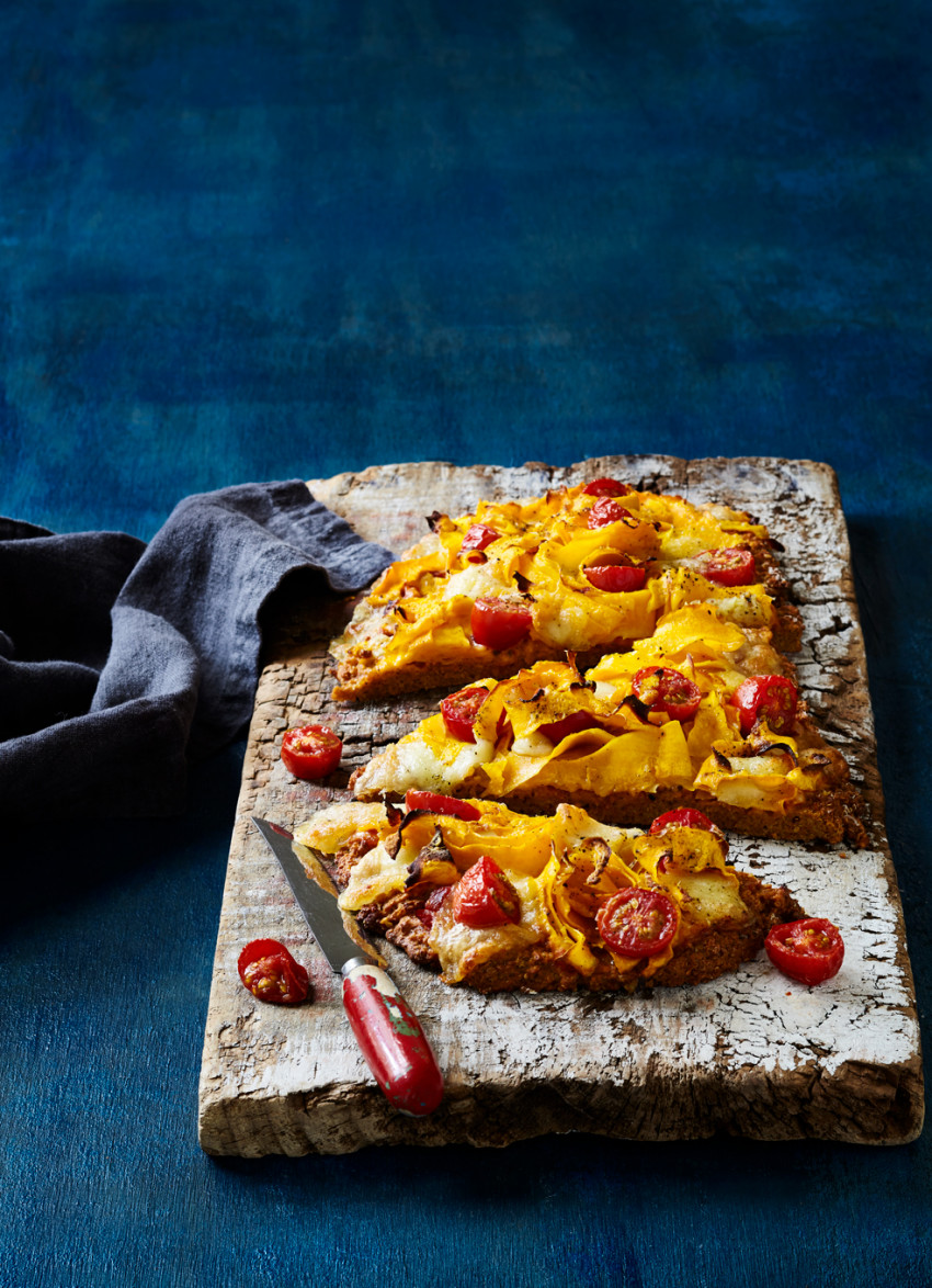 Stir the mascarpone and relish together and spread over the hot base with a spoon. Loosely pile the pumpkin on top and nestle in the tomatoes and mozzarella. Top with a generous grating of parmesan, salt and pepper.
