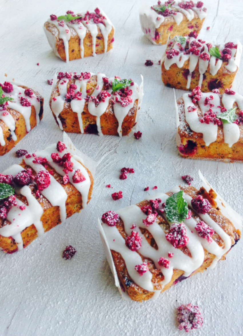Icing: Stir enough orange juice into the icing sugar to make a thick but pourable icing. Drizzle over the cakes and top with dried raspberries, if using.