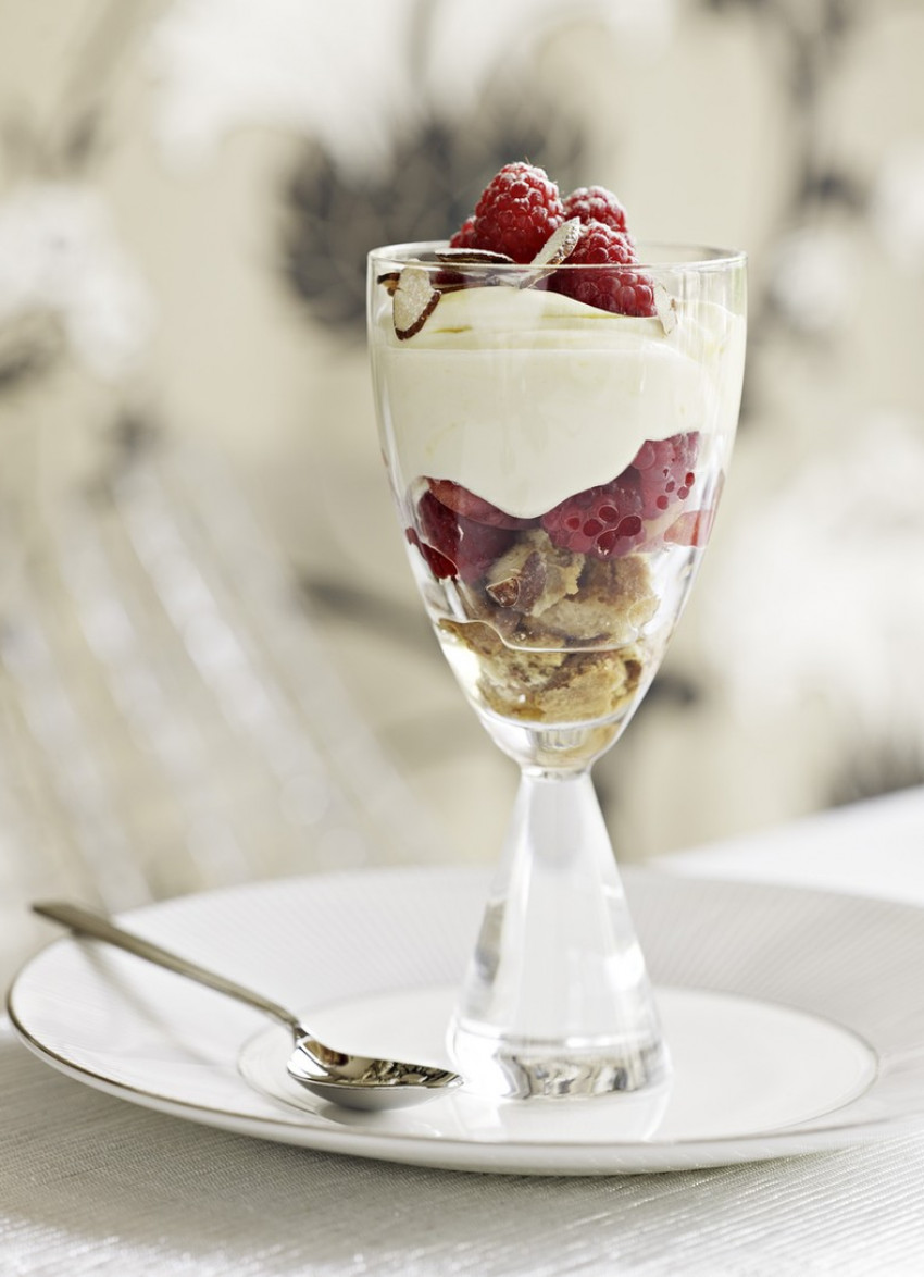 Spoon the mixture into the glasses and top with the reserved raspberries and toasted almonds. Dust with icing sugar.