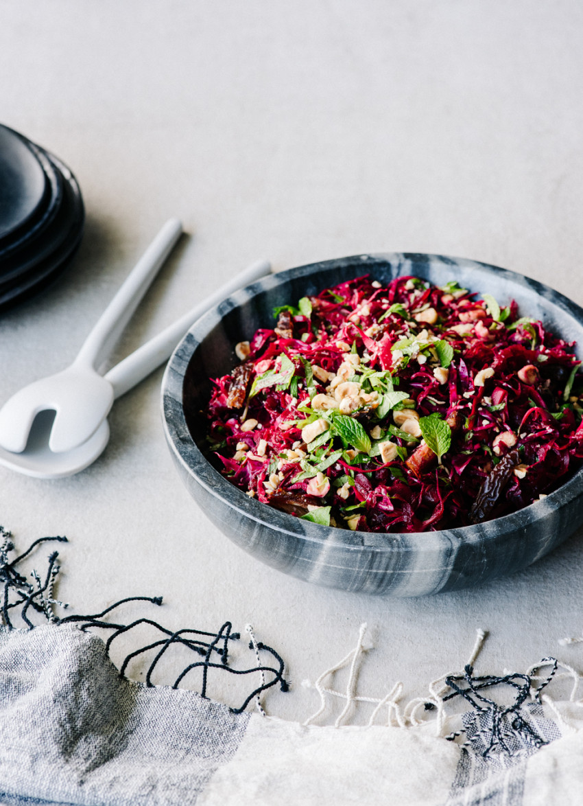 To serve: Season the salad with salt and pepper, then add the dates and half each of the hazelnuts and mint and combine.