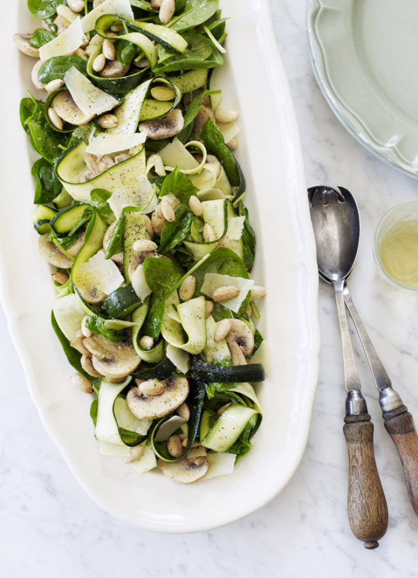 Add the zucchini, spinach and almonds to the mushrooms along with the remaining dressing and gently toss together. Transfer to a serving platter and top with shaved Parmesan.