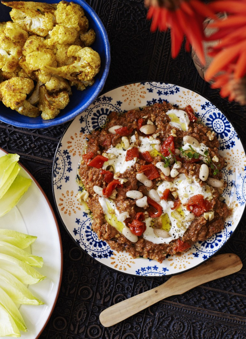 Transfer to a serving bowl and stir in the white beans. Spoon the yoghurt over the top along with the remaining walnuts and capsicum. Drizzle with a little olive oil and freshly ground pepper. Serve with Cauliflower Dippers and witlof. Makes about 2 cups