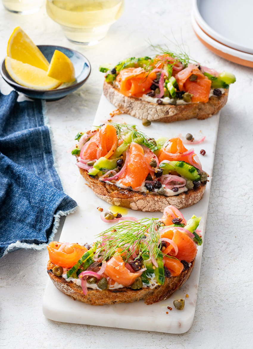 To serve: Drain the liquid off the pickle and discard. Spread the grilled bread with mayonnaise then pile the pickles and cucumber on top along with slices of Regal Salmon. Garnish with herbs, a drizzle of olive oil and season. Makes 4 bruschetta