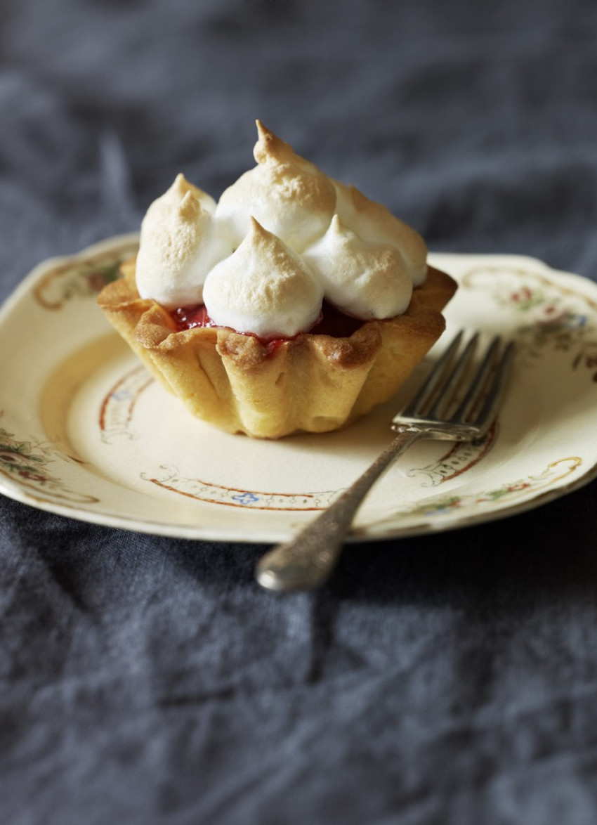 To assemble: Remove the cooked pastry cases from the tins and place on a baking tray. Fill the tarts with the cold rhubarb mixture then pipe or spoon the meringue on top. Bake for 5-7 minutes until the meringue is golden brown. Cool the tarts and serve on the day of making. Makes 12