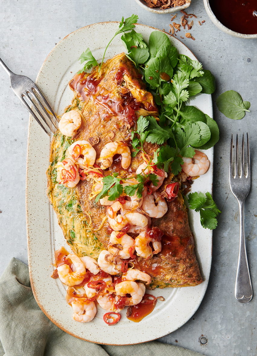Rice Noodle and Coriander Omelette with Chili Prawns