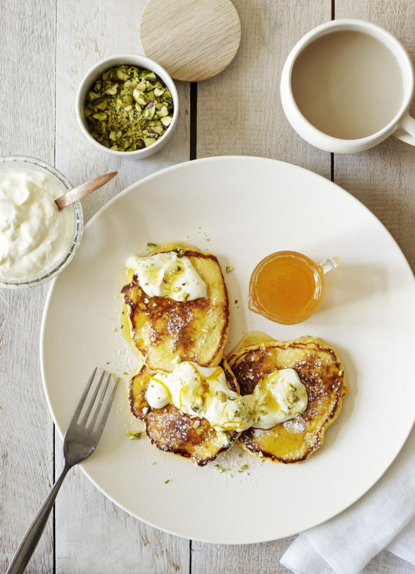 Arrange 3 hotcakes on each plate and top with a spoonful of the cream mixture, chopped pistachios and a dusting of icing sugar. Serve the syrup in small jugs for each person to drizzle over.