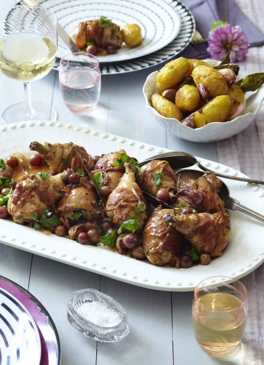 To serve: Transfer the chicken to a serving platter. Stir the parsley into the pan juices and spoon the grapes and sauce over the top.