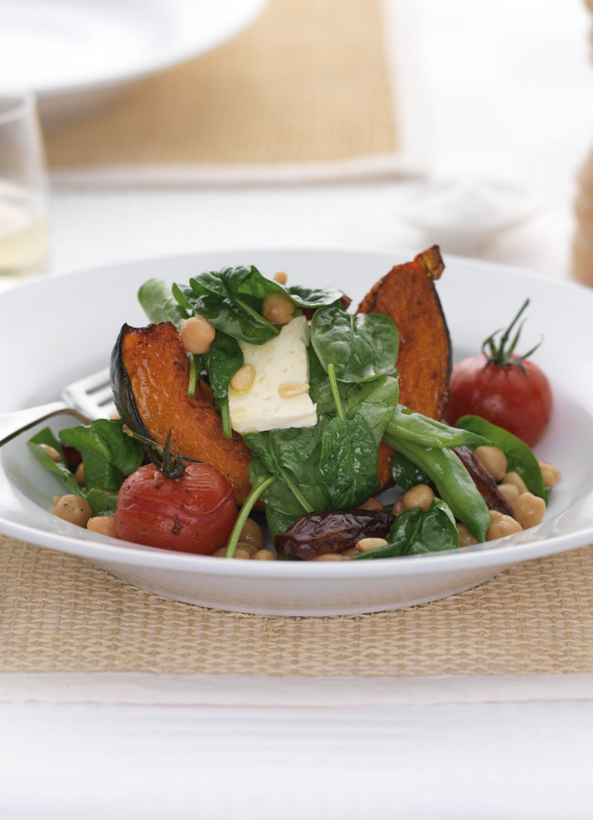 Combine the spices, garlic and oil and brush onto both sides of the pumpkin and over the tomatoes. Season. Roast the pumpkin for about 35 minutes or until tender and caramelised around the edges. Roast the tomatoes until the skin looks wrinkly and starts to split – about 10 minutes.