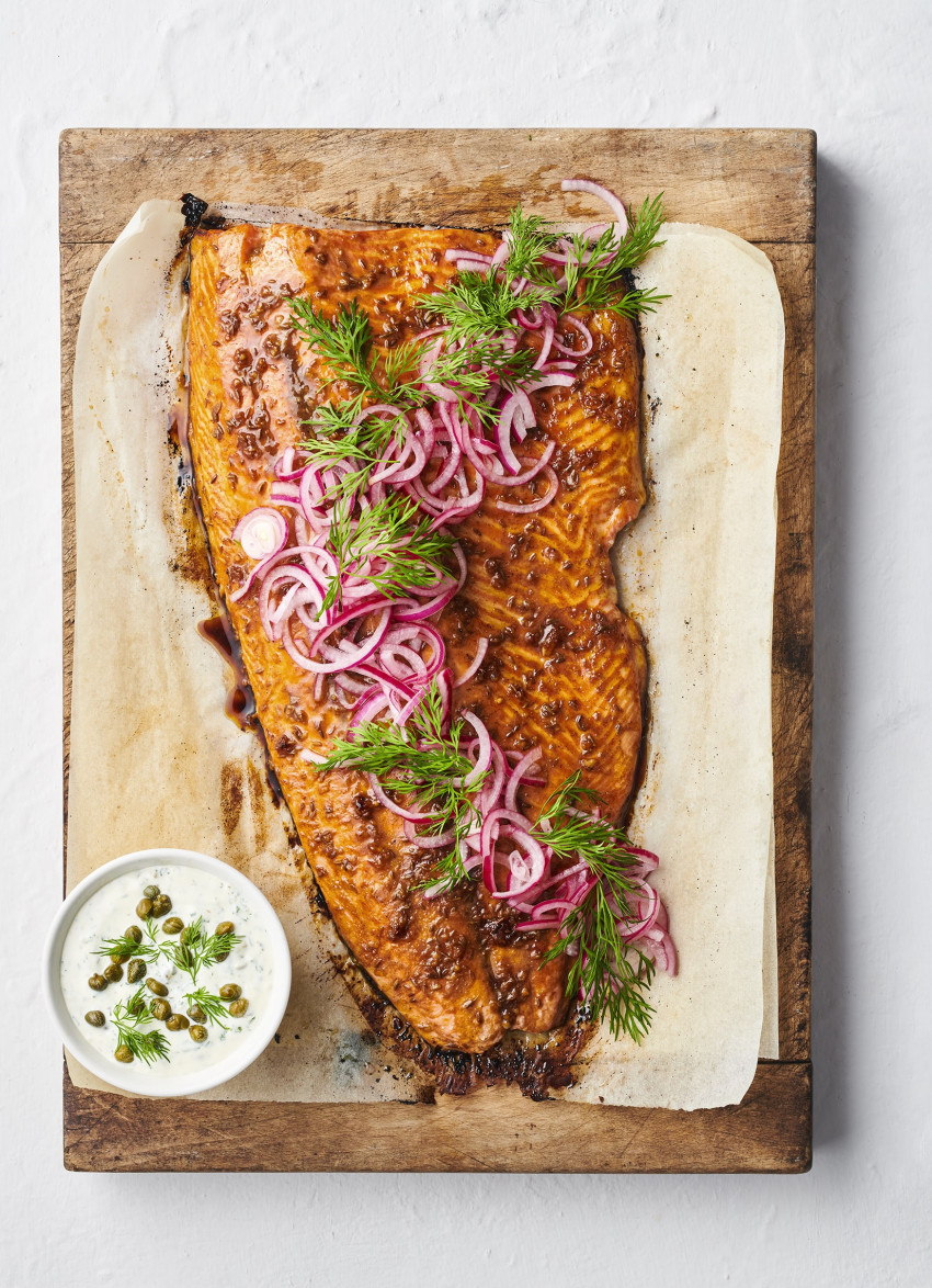 Once cooked, the salmon can be served immediately or refrigerated until half an hour before serving. When ready to serve, garnish with dill fronds and drained onion and serve with the mayo, garnished with capers and dill fronds.