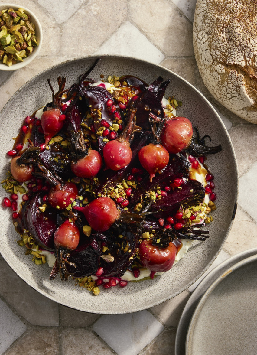 Roasted Beetroot with Pomegranate Dressing and Dilly Yoghurt