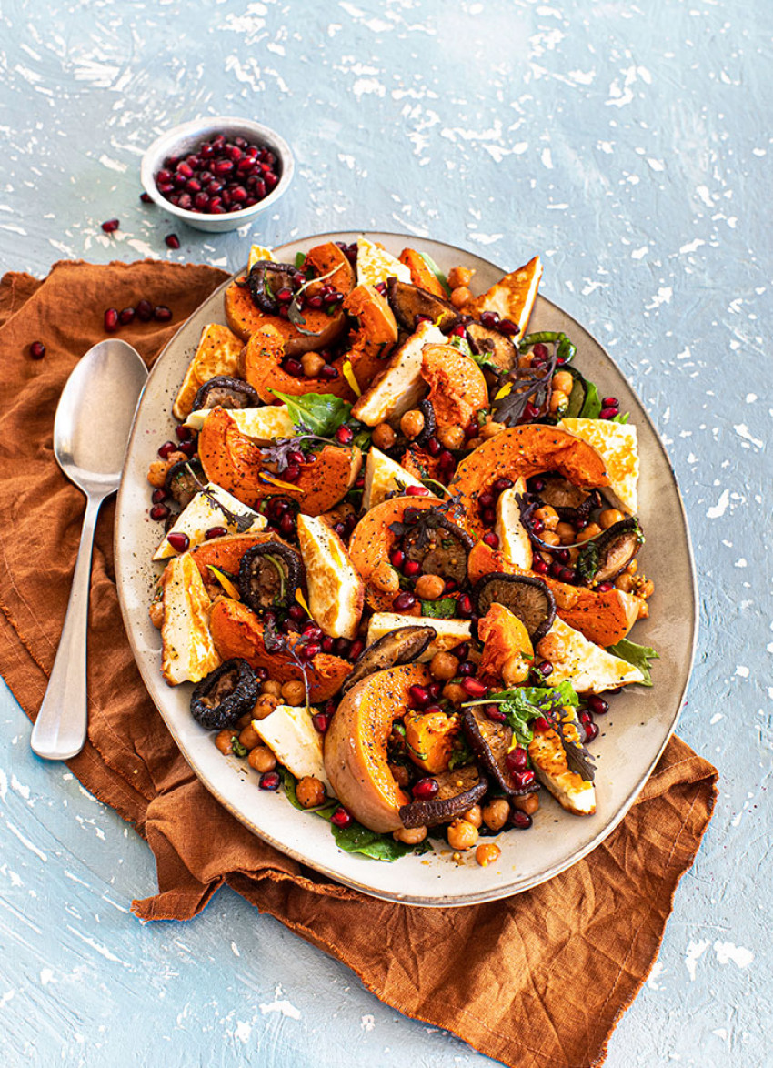 Place the salad leaves on a large serving platter and top with the pumpkin and mushrooms, then drizzle the dressing over everything. Scatter over the chickpeas, haloumi, pumpkin seeds and whichever berry you are using (see Cook’s note).