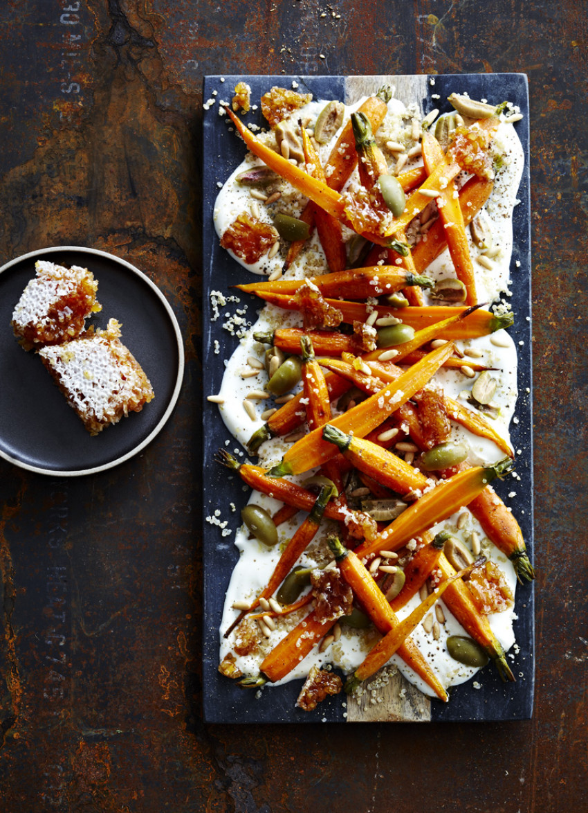 Top with the carrots then the olives and nuts. Add dollops of honeycomb and spoon the dressing over everything.