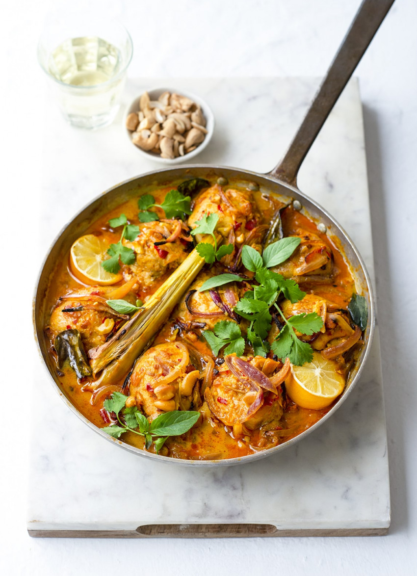 Bake for about 40 minutes, basting occasionally, or until the chicken is fully cooked. Top with coriander and Thai basil and serve with the extra cashew nuts.
