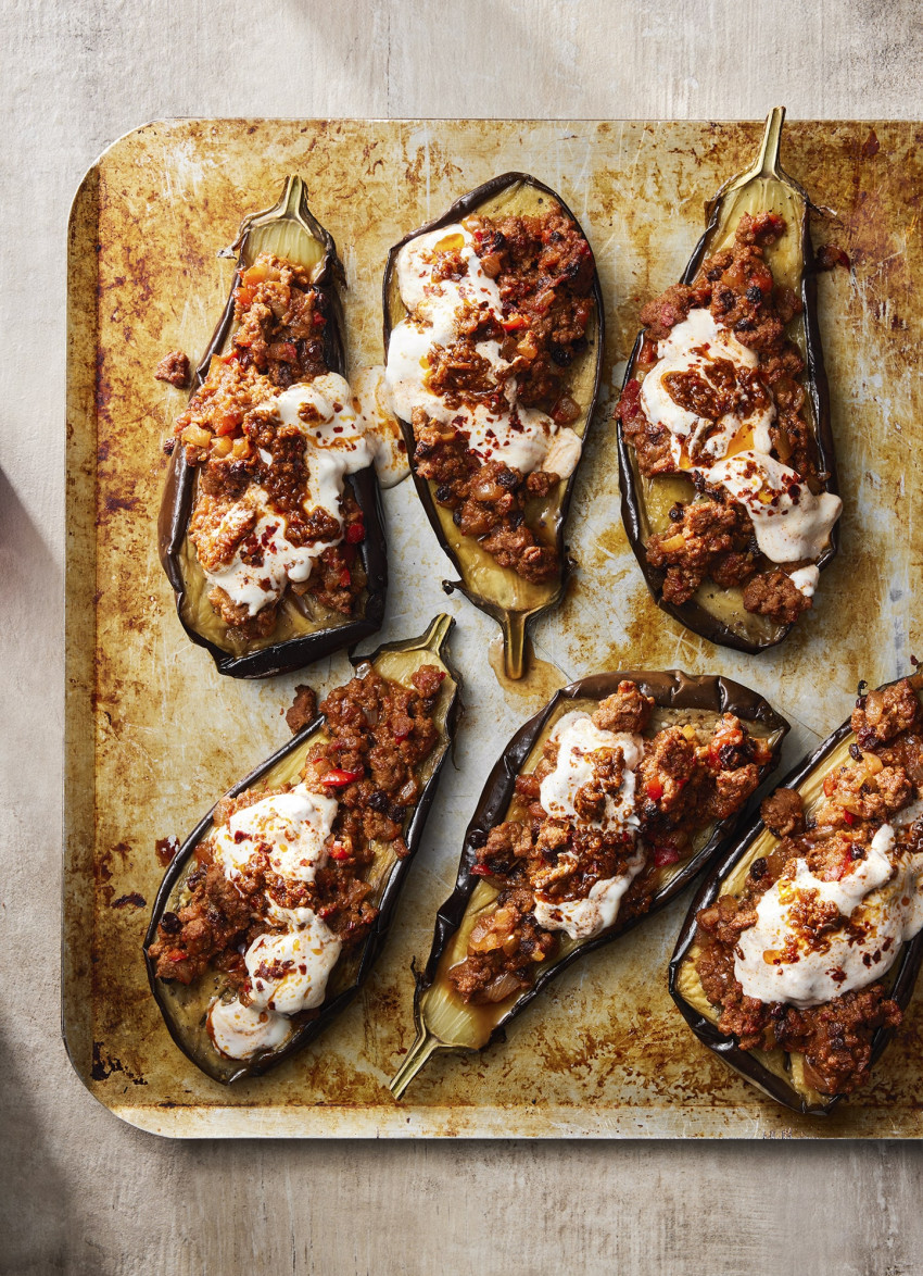 The silky flesh of the roasted eggplants gets topped with an aromatic lamb, currant and pomegranate molasses sauce. A dollop of cooling yoghurt swirled with fiery harissa is the crowning glory of this much-loved dish.