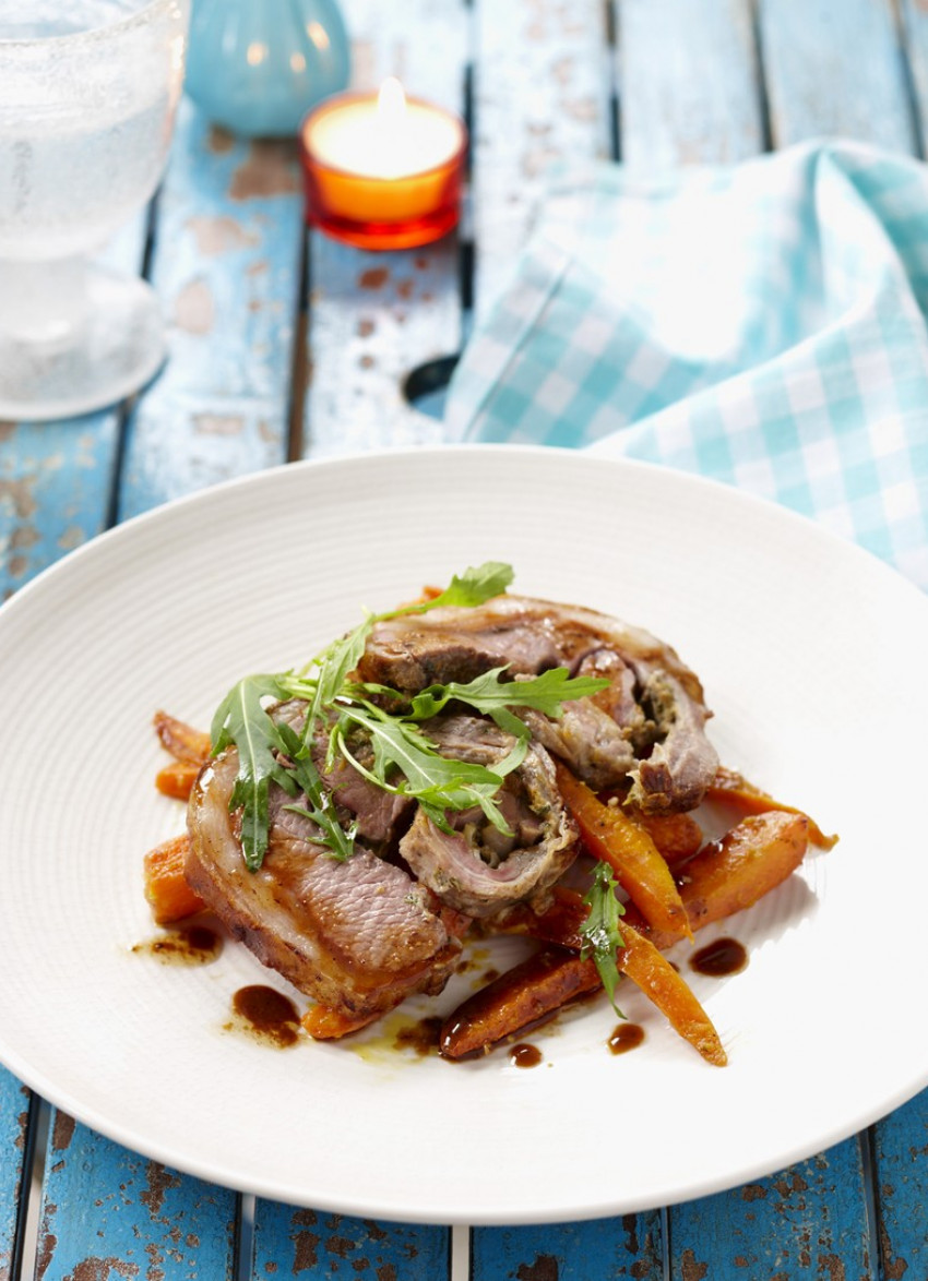 To serve: Remove the string from the lamb and slice. Place the carrots on plates and top with the lamb and rocket, spooning over the meat resting juices.