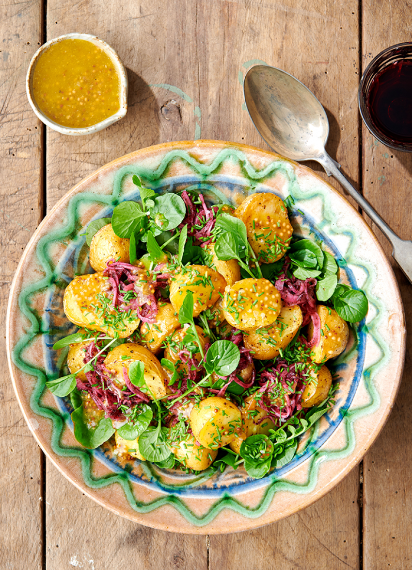 I much prefer roasting potatoes for a salad rather than boiling them. Combined with sumac-marinated onions and a lovely mustardy dressing, this is my go-to potato salad.
