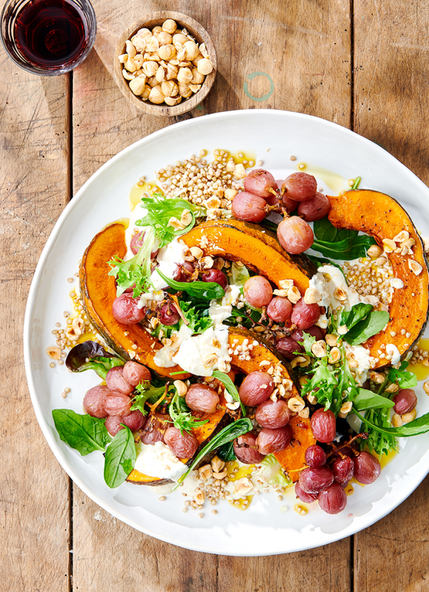 To assemble: Place the kasha, pumpkin and grapes on a large serving platter. Spoon over the dressing, scatter over the hazelnuts and mesclun and and drizzle with olive oil.