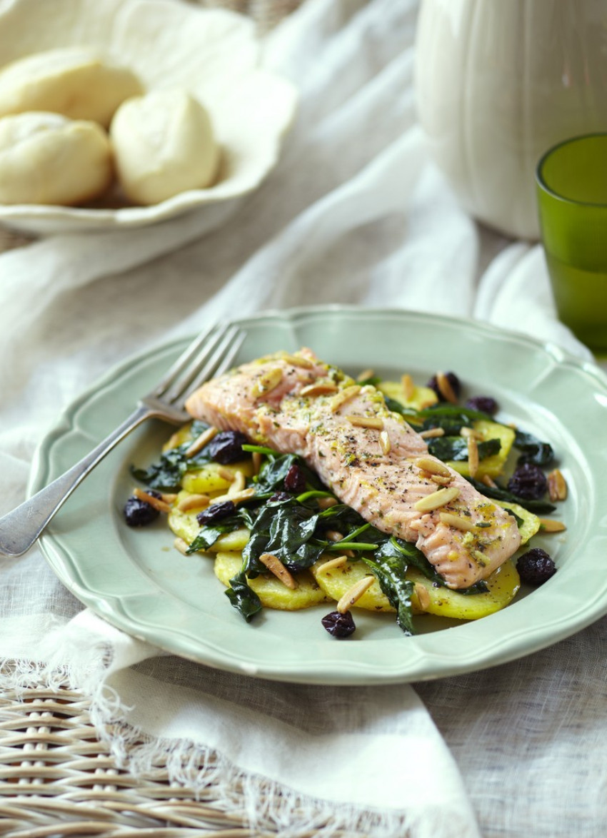 To serve: Place the potatoes and spinach on plates and top with the salmon.