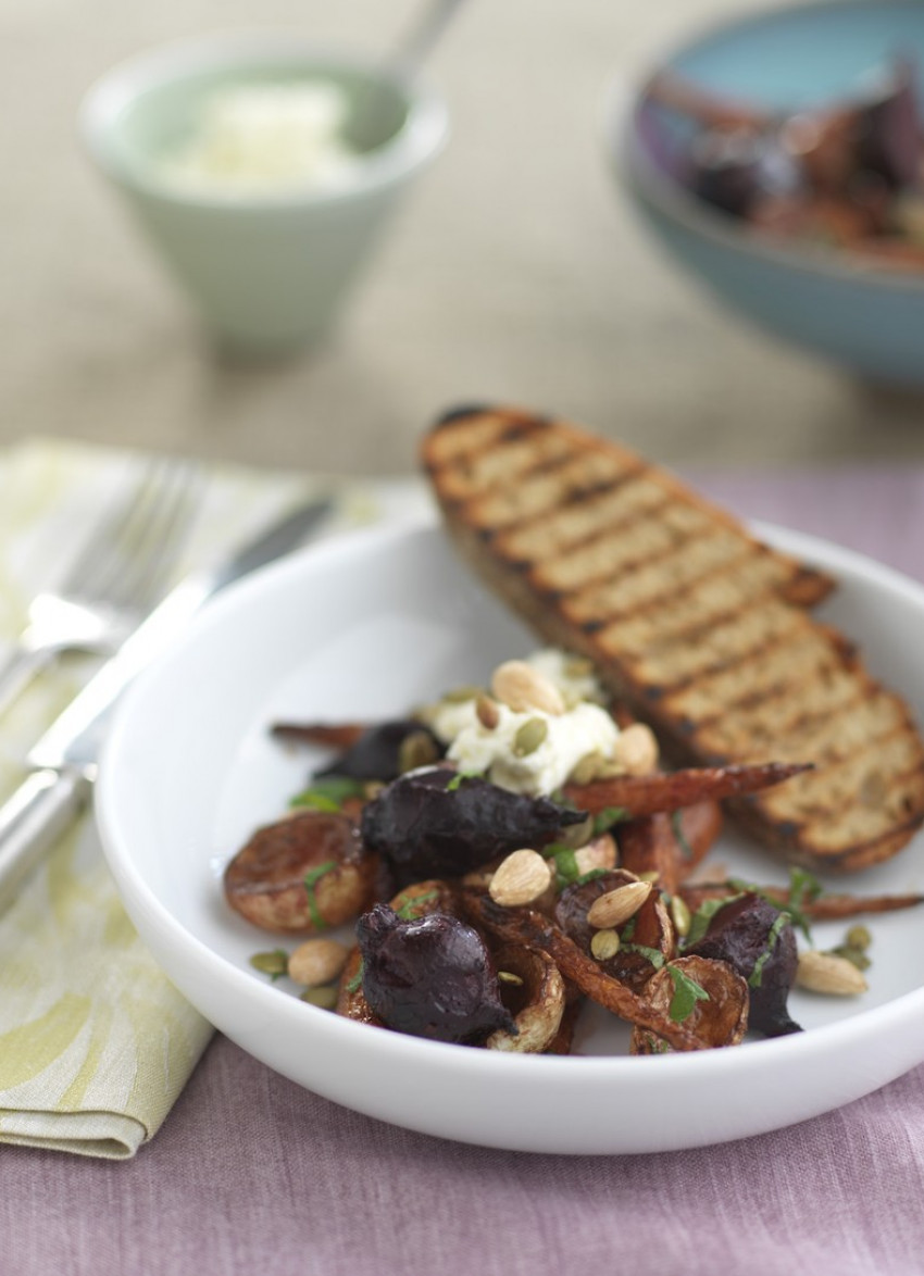Squeeze the juice from the lemon over the slightly cooled vegetables and toss with the mint and extra virgin olive oil. Season then serve in individual bowls topped with a large dollop of ricotta and a sprinkling of pumpkin seeds and almonds.