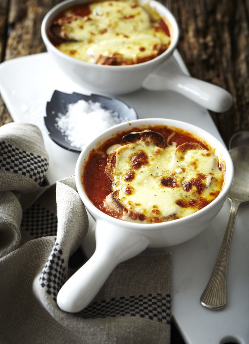 To serve: Brush the bread with olive oil and bake in the oven until lightly golden. Rub one side with the garlic. Divide the soup between ovenproof soup bowls and arrange the bread on top. Pile the mozzarella on top and place under the grill until golden and bubbling.