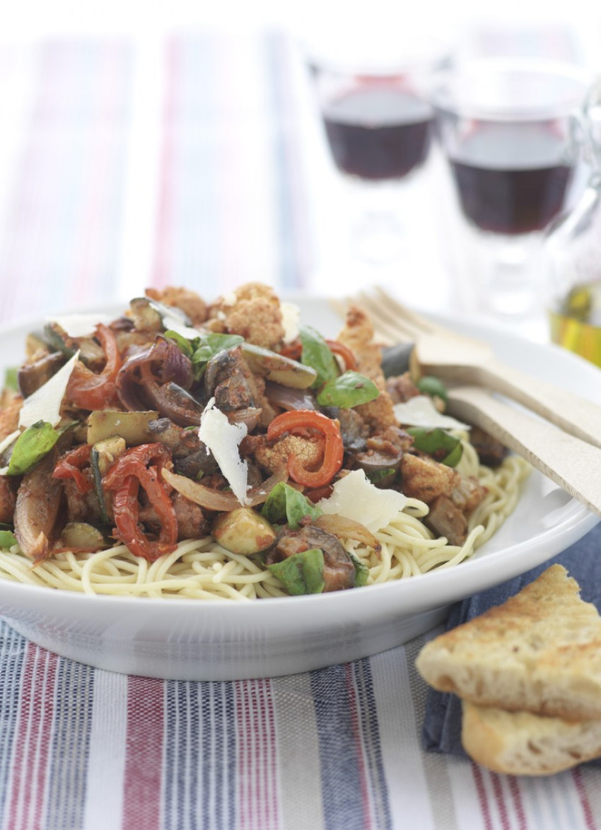 Pasta: Cook the pasta in plenty of boiling, well-salted water until al dente. Drain well and tip into a large serving bowl. Stir the balsamic vinegar and basil through the vegetables and tip the whole lot over the pasta. Top with freshly grated Parmesan.