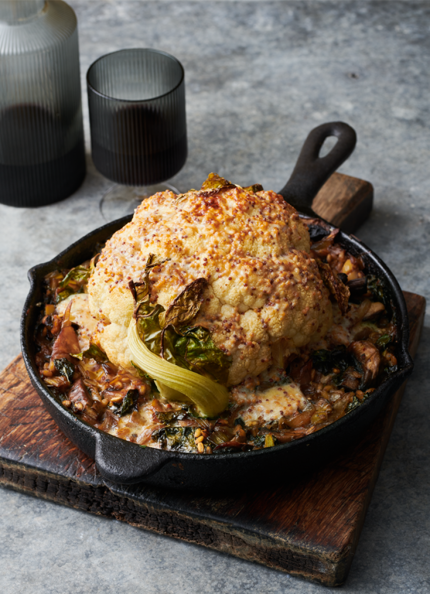 Cauliflower now takes its rightful place as star of the show. Roasted on a bed of leeks, mushrooms and barley with a final rich topping, it’s a meal even hardened carnivores will enjoy.