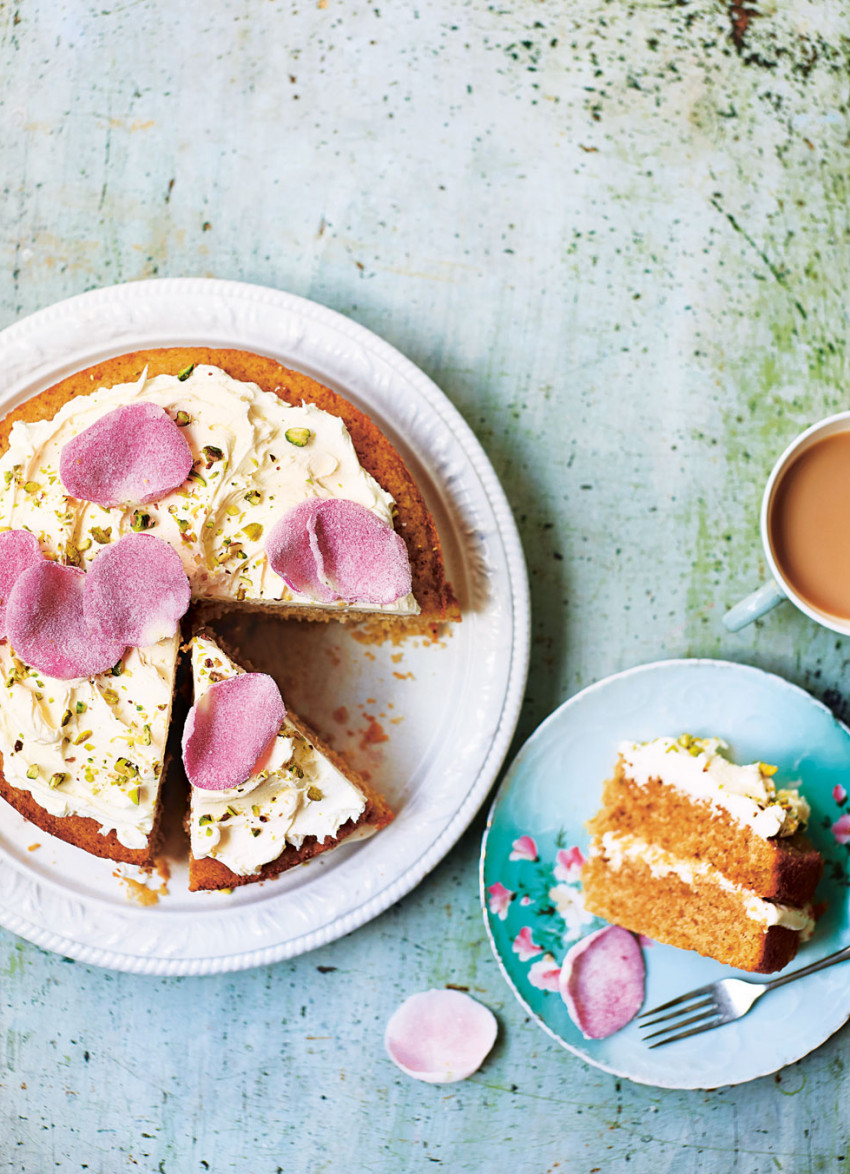 Pipe or spread the buttercream (recipe below) over the top of the cake, or top with more whipped cream. Sprinkle with chopped pistachios and scatter over a few fresh or crystallised rose petals if you have them.