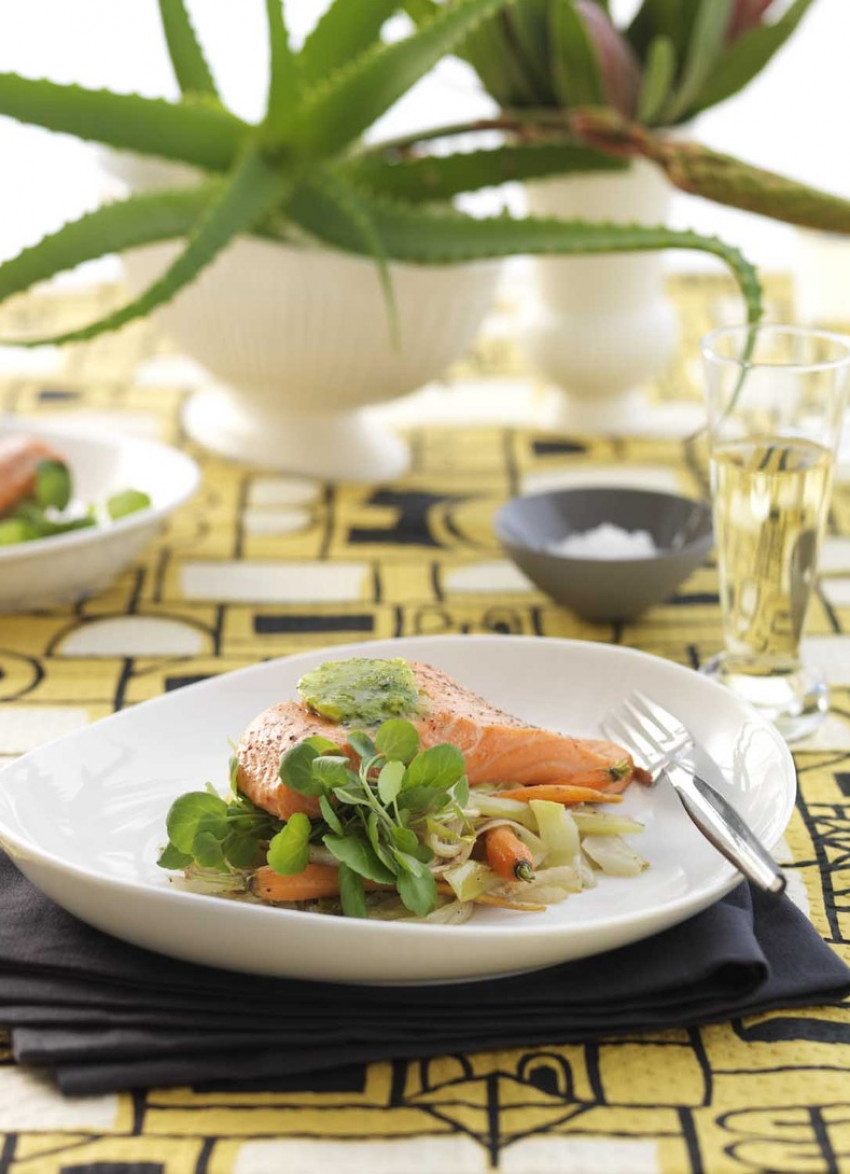 To serve: Divide the vegetables between serving plates and top with a salmon fillet. Cut the butter into 1⁄2 cm slices and place 1-2 pieces on each piece of salmon. Garnish with watercress if desired.