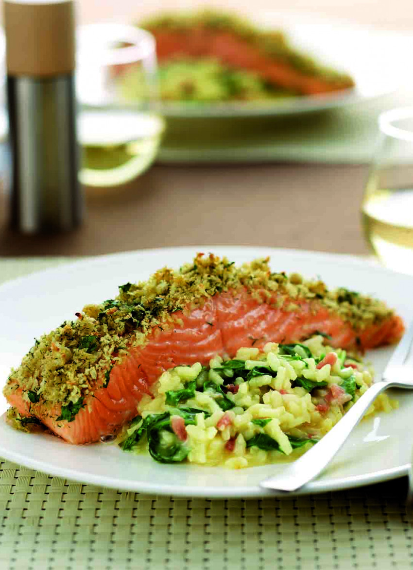 To serve: Spoon the risotto onto plates and top with a piece of salmon.